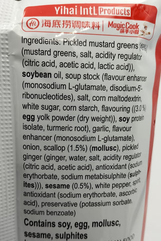 Ingredients: Pickled mustard greens (49%) (mustard greens, salt, acidity regulator (citric acid, acetic acid, lactic acid)), soybean oil, soup stock (flavour enhancer (monosodium L-glutamate, disodium-5'- ribonucleotides), salt, corn maltodextrin, white sugar, corn starch, flavouring ((3.0%) egg yolk powder (dry weight)), soy protein isolate, turmeric root), garlic, flavour enhancer (monosodium L-glutamate), onion, scallop (1.5%) (mollusc), pickled ginger (ginger, water, salt, acidity regulator (citric acid, acetic acid), antioxidant (sodium erythorbate, sodium metabisulphite (sulph- ites))), sesame (0.5%), white pepper, spirit, antioxidant (sodium erythorbate, ascorbic acid), preservative (potassium sorbate, sodium benzoate)