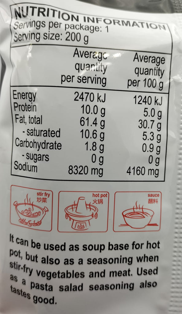 It can be served as soup base for hot pot, but also as a seasoning when stir-fry vegetables and meat. Used as a pasta salad also tastes good.
