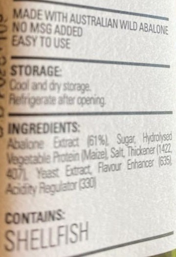 INGREDIENTS: Abalone Extract (61%), Sugar, Hydrolyzed Vegetable Protein (Maize), Salt, Maltodextrin, Thickener (1422, 407), Yeast Extract, Flavour Enhancer (635), Acidity Regulator (330)
