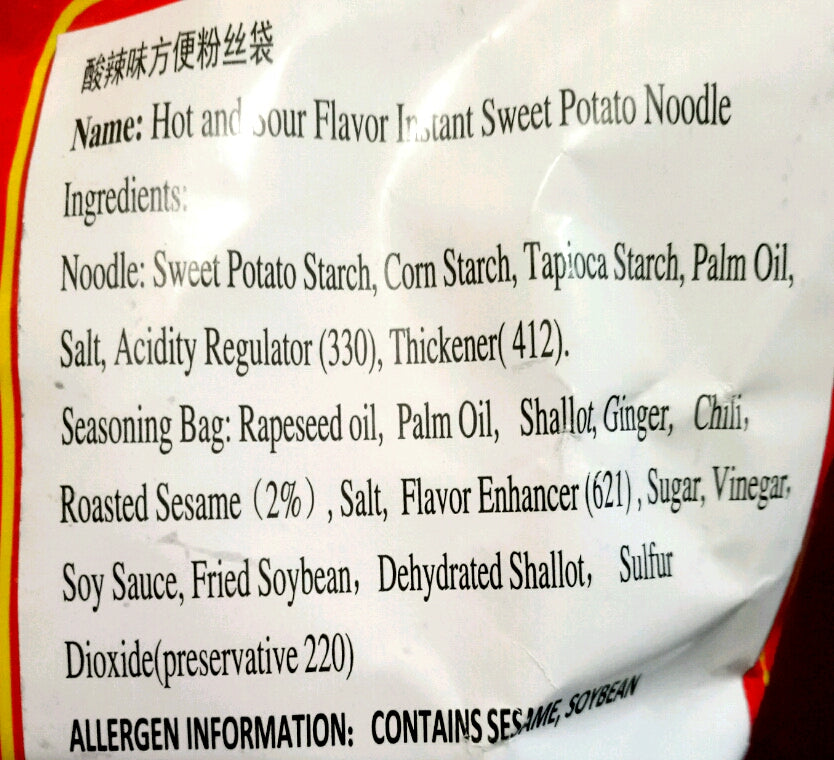 Noodle : Sweet Potato Starch, Corn Starch, Tapioca Starch, Palm Oil, Salt, Acid Regulator (330), Thickener (412)