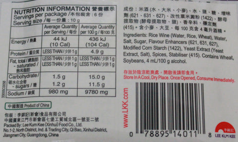 Ingredients: Rice Wine (Water, Rice, Wheat), Water, Salt, Sugar, Flavour Enhancers (621, 631, 627), Modified Corn Starch (1442), Yeast Extract (Yeast Extract, Salt), Spices, Stabiliser (415).