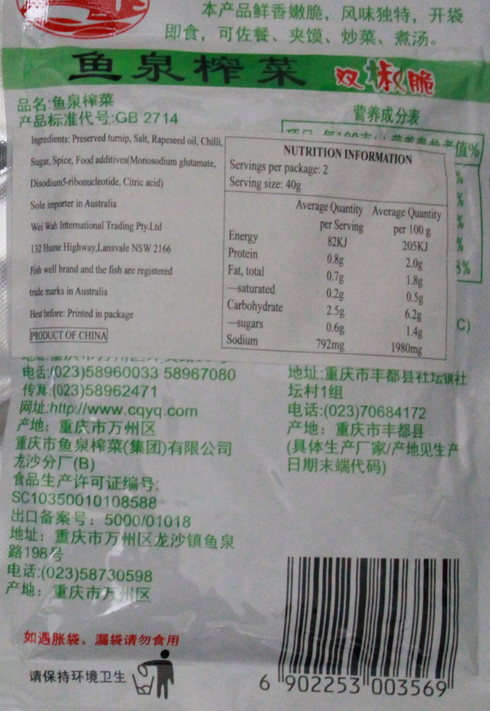 YQ Preserved Vegetables Double Chilli 80g 鱼泉榨菜双椒脆